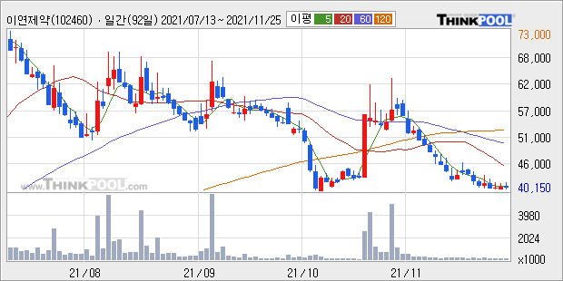 이연제약의 2020년 매출액은 1300억으로 전년대비 -1.2% 하락했고, 영업이익 역시 42억으로 전년대비 -47.5% 하락했다. 이 회사의 매출액 증감률과 영업이익 증감률은 각각 코스피 상위 46%, 하위 26%에 해당된다.