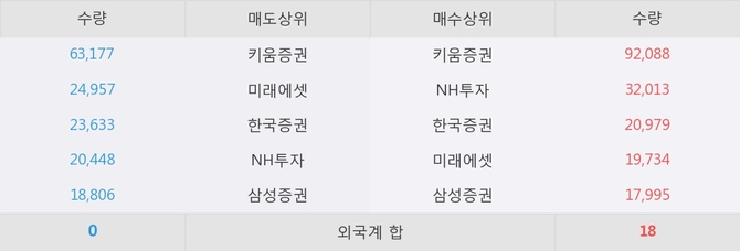 거래원 동향은 NH투자, 미래에셋, 삼성증권 등이 매수 상위 목록에 나타나고 있다.