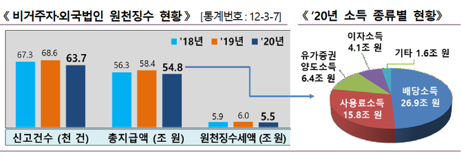 소득 종류별로는 배당소득 26.9조원(49.1%), 사용료소득 15.8조원(28.8%), 유가증권양도소득 6.4조원(11.7%)으로 나타났다.