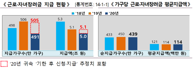 현재까지 집계된 근로·자녀장려금 금액은 정기신청분만 더한 것으로 정기신청기한 이후 신청분까지 합치면 506만 가구, 5.1조원 지급이 될 것으로 관측된다.