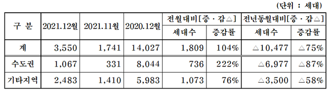 지역별로는 ▲충남(1195가구)이 가장 많았고 ▲대구(844가구) ▲경기도(738가구) ▲부산(206가구) ▲서울(185가구) ▲전남(153가구) ▲인천(144가구) ▲제주도(85가구) 등이다.