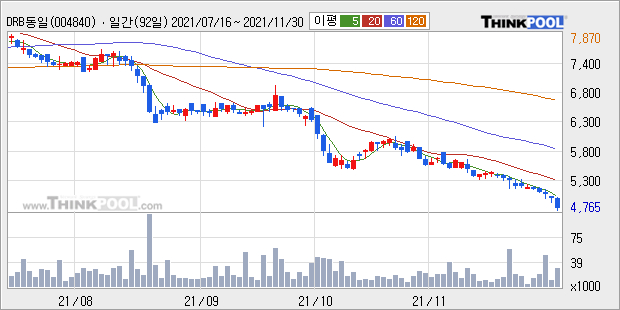 DRB동일의 2020년 매출액은 전년대비 -9.2% 줄어든 4966억원이고, 영업이익 역시 전년대비 -20.5% 줄어든 210억원을 기록했다. 이 회사의 매출액 증감률과 영업이익 증감률은 각각 코스피 하위 33%, 하위 36%에 해당된다.