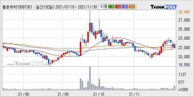 율촌화학의 2020년 매출액은 5206억으로 전년대비 2.8% 상승했고, 영업이익 또한 267억으로 전년대비 3.4% 상승했다. 이 회사의 매출액 증감률과 영업이익 증감률은 각각 코스피 상위 35%, 하위 50%에 해당된다.