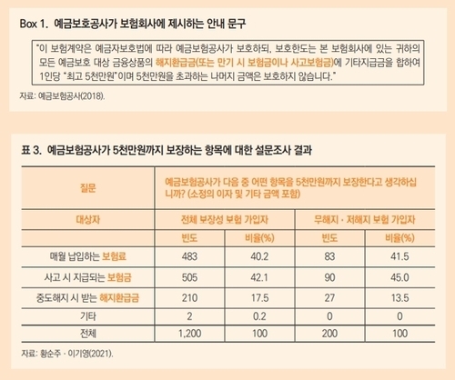 특히 "보장성 보험은 보험사고 발생이라는 예외적인 경우에만 보험금을 지급하므로 같은 보호 한도를 적용하면 보험소비자가 과소 보호되는 문제가 생긴다"며 "은행 예금에 대한 보호 한도가 5천만원이라면 보장성 보험 소비자에 대한 보호 한도는 5천만원을 넘을 필요가 있다"고 강조했다.
