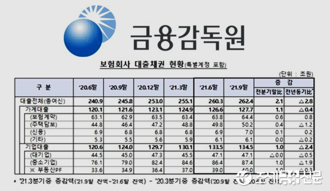 (조세금융신문=최주현 기자) 올해 9월 말 보험회사들의 대출채권 잔액이 262조4천억원으로 전 분기(6월 말) 대비 2조1천억원 증가한 것으로 나타났다.