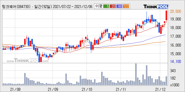 팅크웨어는 2020년 매출액 1976억원과 영업이익 125억원을 기록했다. 전년대비 매출은 8.4%, 영업이익은 59.5% 각각 상승했다. 이 회사의 매출액 증감률과 영업이익 증감률은 각각 코스닥 상위 37%, 상위 25%에 해당된다.