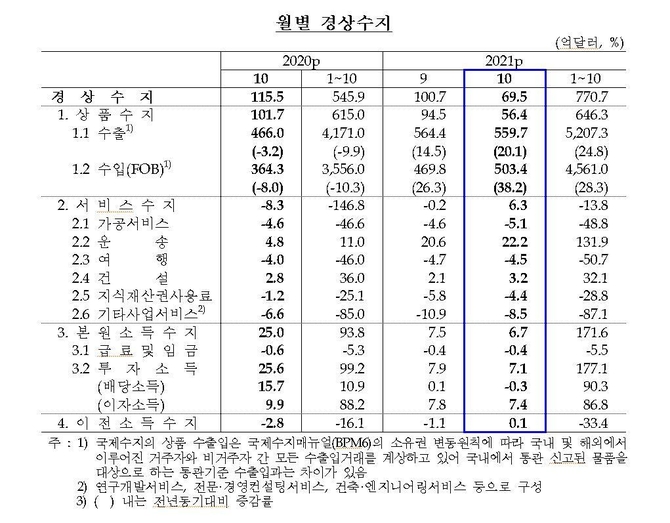 10월 선박 컨테이너운임지수(SCFI)와 항공화물운임지수(TAC·홍콩-미국)가 전년 동월대비 각 212.6%, 64.7% 급등하면서 운송수입(47억7천만달러)이 사상 최대 수준으로 불었기 때문이다. 하지만 여행수지 적자 규모(4억5천만달러)는 작년 10월(4억달러)보다 더 커졌다.