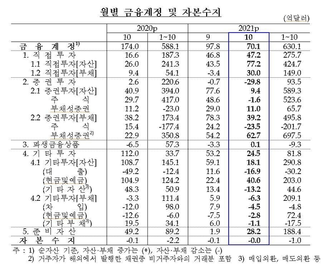 금융계정 순자산(자산-부채)은 10월 중 70억1천만달러 늘었다. 직접투자의 경우 내국인의 해외투자가 77억2천만달러, 외국인의 국내투자도 30억달러 증가했다.