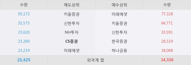 거래원 동향은 미래에셋, 하나금융 등이 매수 상위 목록에 나타나고 있다. 한편, 매도 창구 상위에는 CS증권이 눈에 띄고 있다.