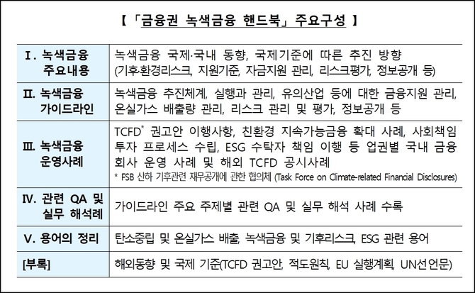 해당 핸드북에는 녹색금융 주요내용, 가이드라인, 운영사례, Ⅳ관련 Q&A 및 실무 해석례, 용어정리 등이 담겼다.
