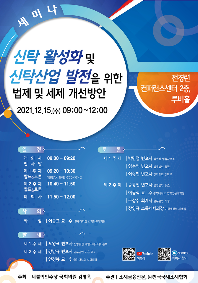 (조세금융신문=진민경 기자) 조세금융신문이 오는 15일 (사)한국국제조세협회와 함께 ‘신탁 활성화 및 신탁산업 발전을 위한 법제 및 세제 개선방안’ 세미나를 개최한다.