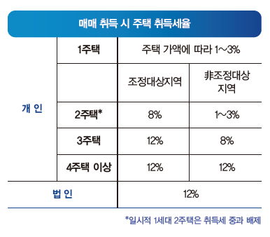 양도 후 새 주택을 취득하거나 주택을 신축할 예정이라면 취득세 부분도 눈여겨보아야 한다. 최근 몇 년간 발표된 수차례의 부동산 대책으로 인해 주택 취득세율에도 많은 변화가 있었다. 핵심은 조정대상지역 내 다주택자의 추가 취득에 대해서 중과세율을 적용하는 것이다. 세대 구성원의 주택 수가 2주택 이상인 다주택자라면 취득 전에 중과되는 취득세에 대한 고민이 선행되어야 하기 때문이다.