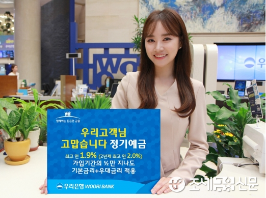 우리은행은 금리가 최고 연 2.03%인 '우리고객님 고맙습니다 정기예금'을 출시했다. 기본 금리는 1년제 연 1.53%, 2년제 연 1.63%이고, 최대 연 0.40%포인트 우대금리를 추가로 제공한다. 중도에 해지(약정기간 절반 경과 후 해지)하더라도 기본금리와 우대금리를 모두 적용받을 수 있다.