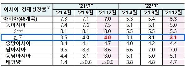 49개 아시아 역내국 중 일본, 호주, 뉴질랜드를 제외한 46개국의 내년 평균 경제 성장률은 5.3%, 올해 성장률은 7.0%로 9월보다 모두 0.1%p씩 내렸다.