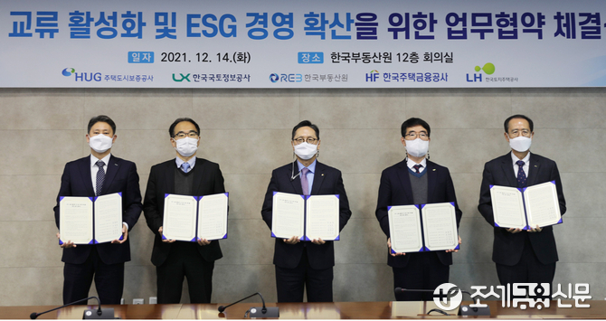 HUG는 14일 연구 교류 활성화와 환경·사회·지배구조(ESG) 경영 확산을 위해 한국국토정보공사, 한국부동산원, 한국주택금융공사, 한국토지주택공사 등 4개 공공기관 산하 연구원과 업무협약을 체결했다.