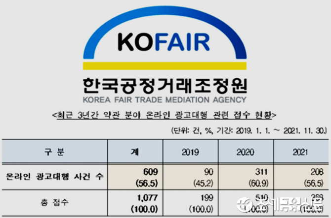 15일 한국공정거래조정원에 따르면 최근 3년간(2019년 1월∼2021년 11월) 조정원에 접수된 약관 분야 전체 분쟁 1천77건 중 56.5%(609건)가 온라인 광고대행 관련 분쟁이며, 피해 사례는 모두 계약해지 과정에서 표면화됐다.