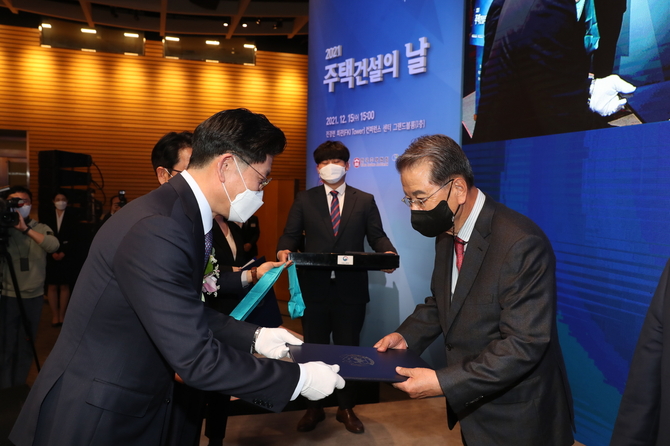 주택산업발전에 기여한 공로가 큰 주택건설인과 주택건설단체 관계자 등 55명에게는 정부포상과 국토부 장관 표창 등이 수여됐다.