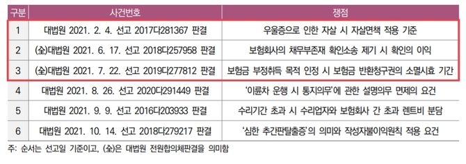 이러한 내용은 보험연구원이 낸 간행물 ‘보험법리뷰’ 14호 중 ‘2021년 보험 관련 중요 판례 분석’ 보고서에 담겼다.