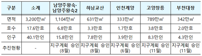 확정된 지구계획에 따르면, 5개 3기 신도시에서는 3200만㎡의 면적에 분당과 일산을 합한 규모를 뛰어넘는 총 17만6000호(인구 약 40만명)의 주택을 공급한다.