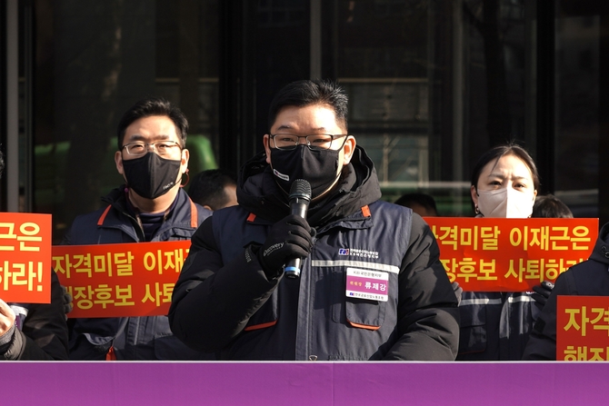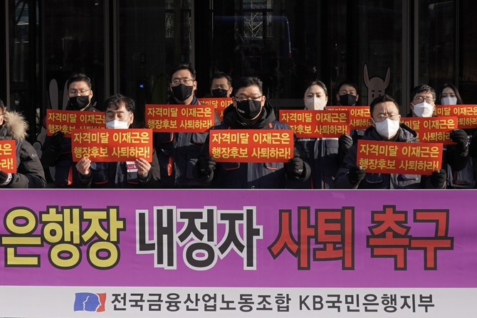 이날 오전 국민은행 신관 앞에서 기자회견을 연 국민은행 노조는 “자격 미달 은행장 후보자 선임을 강력히 반대한다”고 목소리를 높였다.