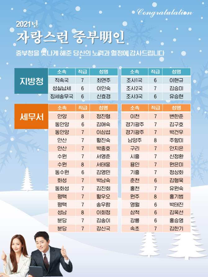중부국세청은 지난 10월 직원대표위원회와 설문조사를 거쳐 중부明인 제도의 명칭과 세부사항에 대한 의견을 수렴하고, 그 결과 지방청 국별 1명씩, 세무서별 1명씩, 직원(관리자 제외) 총 36명을 올해 최초로 중부明인을 선발했다.