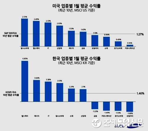 (조세금융신문=최주현 기자) 새해 첫달 주식시장 효자 업종은 한국 증시에서 헬스케어, 미국 증시에서는 필수소비재로 나타났다.