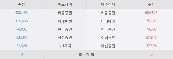 이 시각 주요 거래원은 미래에셋, 키움증권, 한국증권 등이 매수 상위 창구에 자리하고 있다.