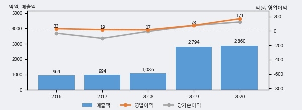 최근 3년간의 실적을 살펴보면 안정적 성장세를 보이고 있다. 최근 3년간 매출로 볼 때 매년 꾸준히 증가하고 있다. 다만 최근에 그 증가폭이 다소 감소하고 있다.