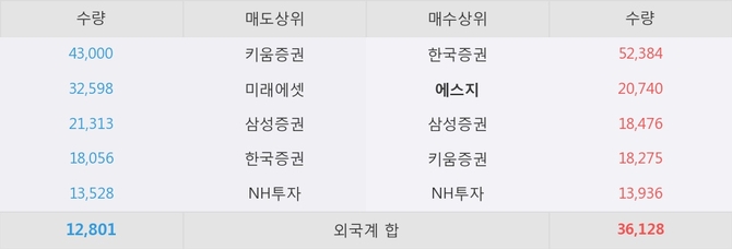 거래원 동향은 에스지, 삼성증권, NH투자 등이 매수 상위 목록에 나타나고 있다.