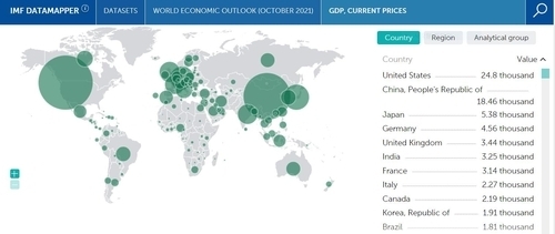 또 8위 이탈리아(2조2천700억 달러), 9위 캐나다(2조1천900억 달러), 10위 한국(1조9천100억 달러)을 앞질렀다.