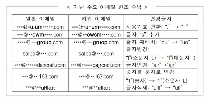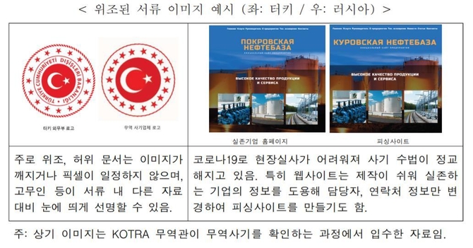 또 ▲ 구매대금 입금영수증, 수표 등을 위조해 입금 완료했다고 속여 제품을 편취한 '서류위조' ▲ 계약 체결한 수출기업과 연락이 두절돼 상품을 못 받거나 수출기업이 의도적으로 선적을 거부하는 '선적불량' ▲ 무역 당사자 간 이메일을 탈취해 결제 대금을 가로채는 '이메일사기' 등의 유형도 있다.