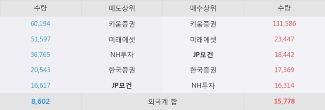 거래원 동향은 JP모건, 미래에셋, NH투자 등이 매수 상위 목록에 나타나고 있다. 한편, 매도 창구 상위에는 JP모건이 눈에 띄고 있다.