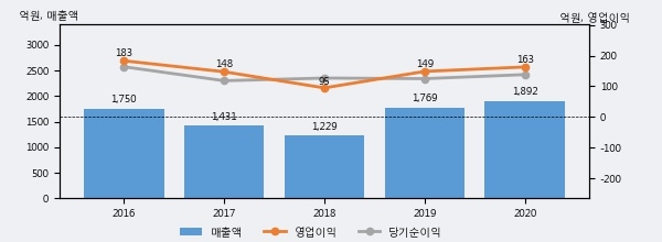 최근 실적을 살펴보면 2020년 매출액이 최근 5년 중 가장 높은 실적을 기록했음을 알 수 있다. 이전 최고 실적이었던 2019년 보다도 6.9%(122억 4천만원) 늘어난 것으로 나타났다.