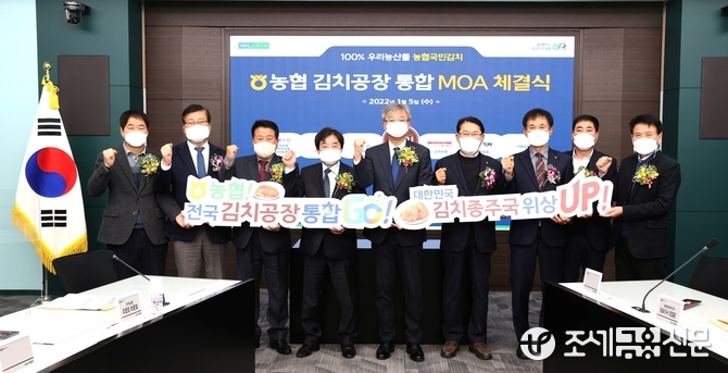 (조세금융신문=구재회 기자) 농협경제지주는 5일 서울 중구 농협중앙회 본관에서 전국 8개 김치공장 운영농협 조합장과 김치공장 통합을 위한 합의각서(MOA)를 체결했다고 밝혔다.