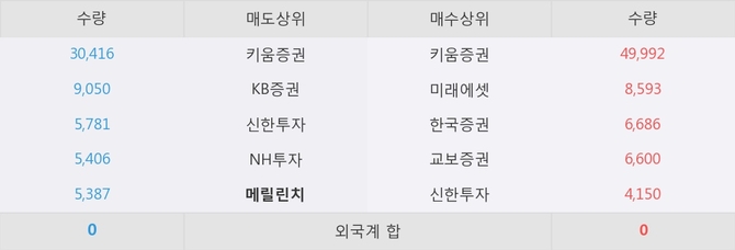 이 시각 주요 거래원은 미래에셋, 키움증권, 한국증권 등이 매수 상위 창구에 자리하고 있다. 한편, 매도 창구 상위에는 메릴린치가 눈에 띄고 있다.