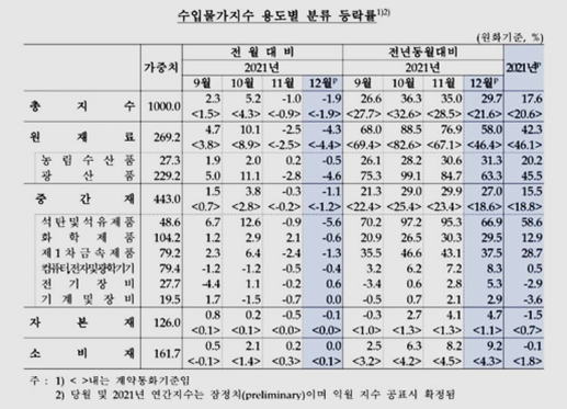 하지만 작년 12월 기준 수입물가지수는 127.11로, 11월(129.63)보다 1.9% 하락했다. 전월과 비교하면 두 달 연속 하락이지만, 1년 전과 비교하면 여전히 29.7% 높은 수준이다.