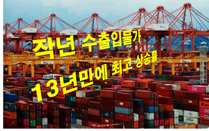 수출물가지수 평균값은 94.74에서 108.29로 14.3% 올랐는데, 이같은 수입·수출물가지수 평균 상승률은 2008년(평균 각 36.2%, 21.8%) 이후 가장 높은 수준이다.