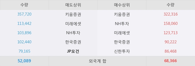 거래원 동향은 NH투자, 미래에셋 등이 매수 상위 목록에 나타나고 있다. 한편, 매도 창구 상위에는 JP모건이 눈에 띄고 있다.