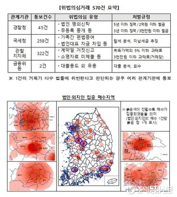 국토부는 "이번에 적발한 위법 의심 거래 570건은 관계기관 조사를 통해 후속 조치가 이뤄지고, 위법 거래 적발을 위한 후속 기획조사도 강도 높게 추진할 것"이라며 "거래가격이 급등하고 법인·외지인·미성년자의 매수가 많은 특이동향 지역에 대한 모니터링 시스템을 구축해 투기 의심 거래를 심층 조사할 계획"이라고 말했다.