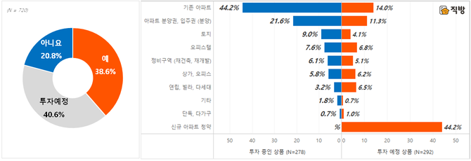 14일 직방이 발표한 직방 애플리케이션(앱) 이용자 720명에 대한 설문조사 결과에 따르면 재테크, 투자 수단으로 ‘부동산’을 보유하고 있는지에 대한 질문에 전체 응답자(720명) 중 38.6%(278명)가 ‘예’라고 응답했다.