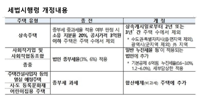 사회적 기업·사회적 협동조합·종중 주택도 일반 누진세율을 적용하고 시·도 등록문화재나 어린이집용 주택은 비과세하는 내용도 시행령에 포함됐다.