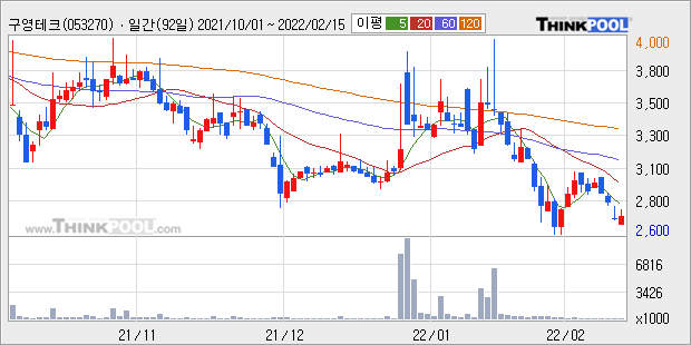 구영테크의 2020년 매출액은 1967억으로 전년대비 -14.8% 하락했고, 영업이익 역시 29억으로 전년대비 -43.9% 하락했다. 이 회사의 매출액 증감률과 영업이익 증감률은 각각 코스닥 하위 25%, 하위 32%에 해당된다.