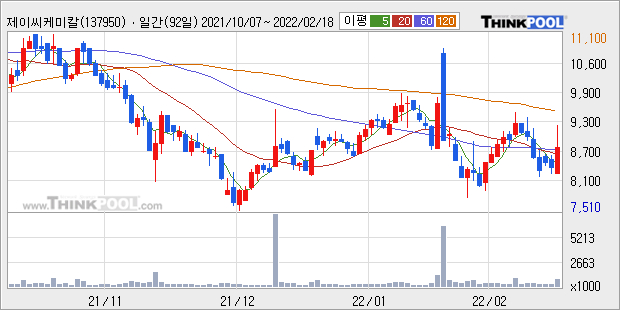 제이씨케미칼의 2020년 매출액은 2677억으로 전년대비 32.3% 상승했고, 영업이익 또한 192억으로 전년대비 48.0% 상승했다. 이 회사의 매출액 증감률과 영업이익 증감률은 각각 코스닥 상위 15%, 상위 30%에 해당된다.