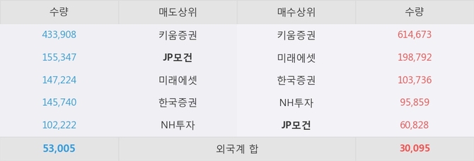 거래원 동향은 JP모건, 미래에셋, NH투자 등이 매수 상위 목록에 나타나고 있다. 한편, 매도 창구 상위에는 JP모건이 눈에 띄고 있다.