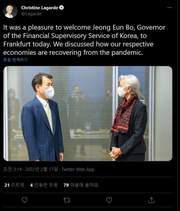 라가르드 ECB 총재는 16일(현지시간) 트위터에 "오늘 프랑크푸르트를 방문한 정은보 한국 금융감독원장을 맞이해 기쁘다"며 "두(유로존과 한국) 경제가 어떤 식으로 팬데믹으로부터 극복할지 논의했다"고 게재했다.