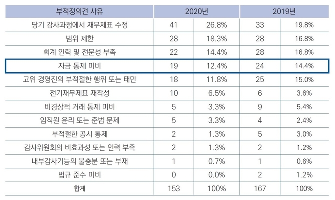 삼정KPMG(회장 김교태)가 21일 발간한 ‘감사위원회 저널 20호’에 따르면, 내부회계관리제도 부적정 감사(검토)의견 중 자금통제 미비로 지적받은 기업이 2019년 14.4%, 2020년 12.4%로 나타났다. 미국의 경우 2020년 1건(0.3%)인 것과 비교할 때 빨간 등이 켜진 셈이다.