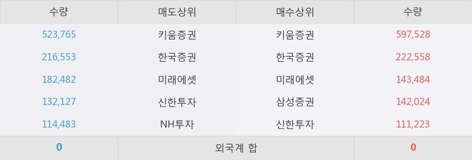 아직까지 외국계 증권사 창구를 통한 매매는 발생하지 않고 있다. 그리고 이 시간 한국증권이 매수창구상위에 올라있는 종목은 이 종목 이외에도 마니커에프앤지, 대한제당 등이 있다.