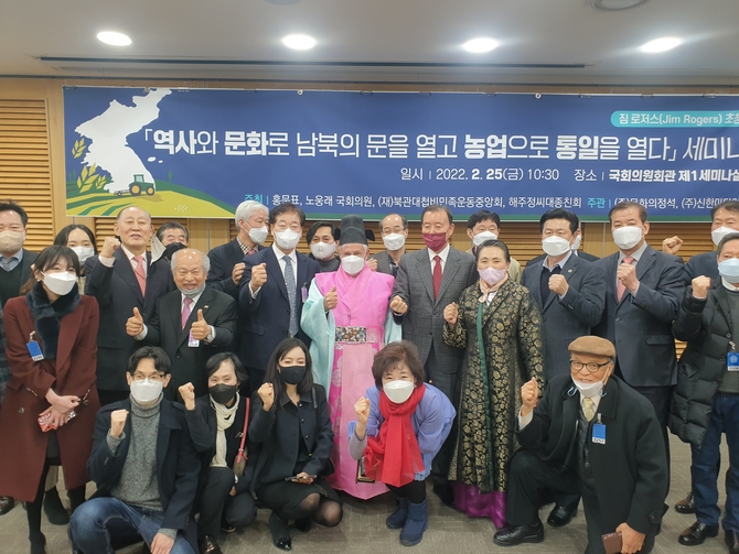 짐 로저스 회장은 25일 국민의힘 홍문표 의원(충남 예산‧홍성)과 더불어민주당 노웅래 의원(서울 마포갑), 이존영 북관대첩비민족운동중앙회 이사장이 공동으로 주최한 ‘북관대첩비 전시회’ 및 ‘농업으로 통일을 열다’ 세미나에 참석해 이같이 말했다.