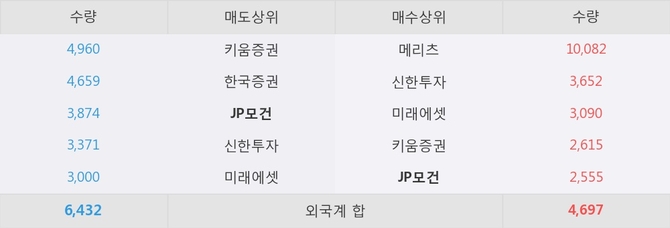 거래원 동향은 JP모건, 메리츠, 미래에셋 등이 매수 상위 목록에 나타나고 있다. 한편, 매도 창구 상위에는 JP모건이 눈에 띄고 있다.
