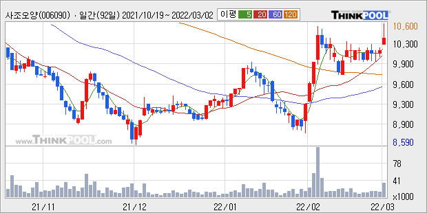 사조오양의 2020년 매출액은 전년대비 4.5% 늘어난 3276억원이고, 영업이익 또한 전년대비 18.2% 늘어난 267억원을 기록했다. 이 회사의 매출액 증감률과 영업이익 증감률은 각각 코스피 상위 29%, 상위 39%에 해당된다.
